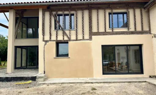 Bardage d'une ancienne façade de maison à Mirande : ce projet met en valeur une rénovation complète d’un bâti ancien avec une finition soignée et durable. Façade Festi-Max…